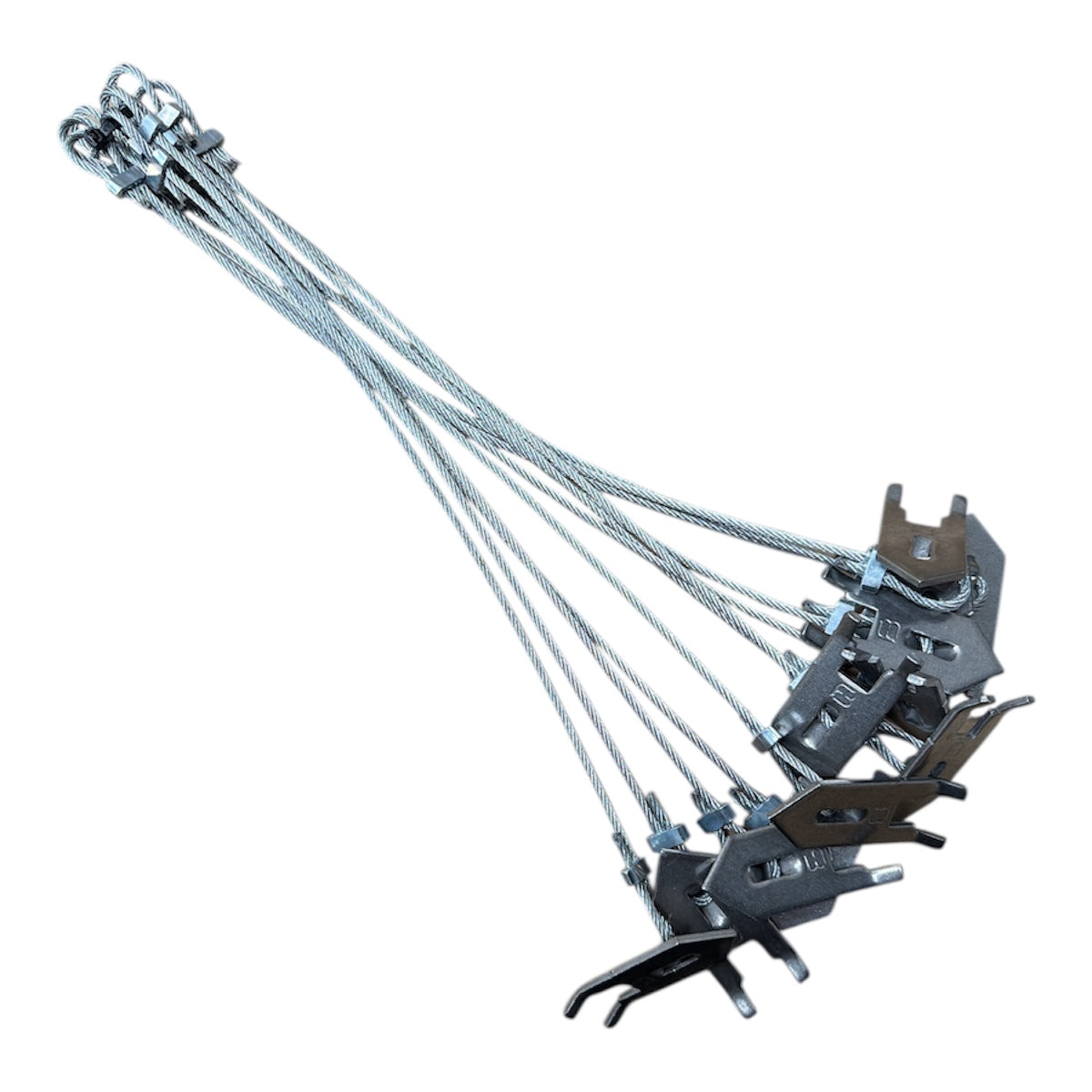 Freedom Brand Wolf Fang stakes with 15” of 1/8” cable. These stake anchors have a large surface area and are strong enough to be used in all soil conditions, including frozen ground. Once set, this anchor stays put.